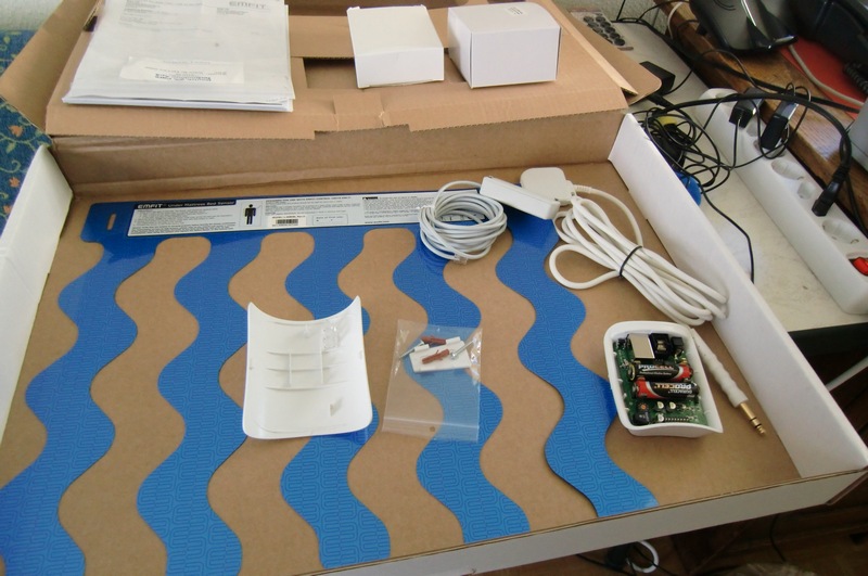 Rechts im Bild das geoffnete Geraet und die blaue Sensor-Matte im Karton. Der Deckel des Geraetes liegt links. Um Einstellungen vorzunehmen, nimmt man den Deckel ab.