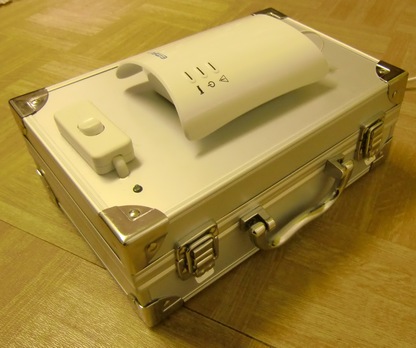 Damit das Geraet auch bequem eingesetzt und auf Reisen mitgenommen werden kann, alle sonst herumliegenden Teile in ein Kosmetikkoefferchen aus dem Supermarkt untergebracht, darauf das Geraet montiert und einen Ein/Aus-Schalter davor angebracht (aehnlich wie beim Epi-Care).