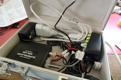 Der Koffer und sein Innenleben: der Sender (getrennt besorgt) links unten und zwei Netzadapter.