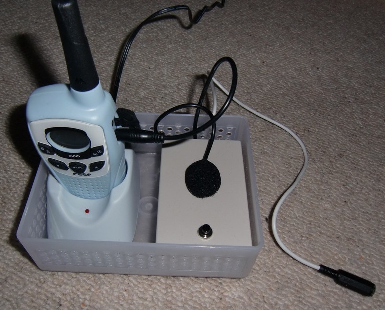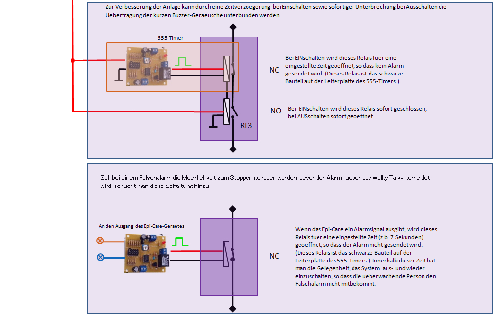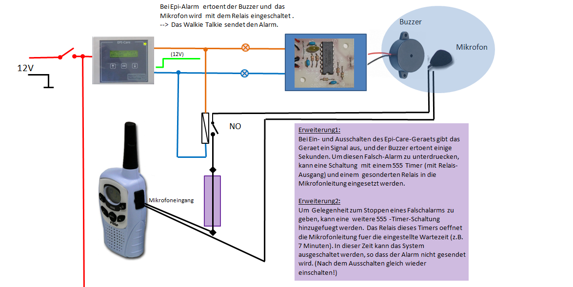 An das Sendegeraet ("b" im Display wie baby) ist ueber ein Kabel ein Mikrofon angeschlossen, das mittels einer kleinen Relais-Schaltung nur eingeschaltet wird, wenn das Epi-Care einen Alarm gibt. So wird verhindert, dass Stimmen und Geraeusche das Geraet automatisch einschalten (VOX). Ausserdem ist die Lautstaerke des Lautsprechers auf Null eingestellt, so dass eventuelle "Stoersender" von der zu ueberwachenden Person nicht wahrgenommen werden.