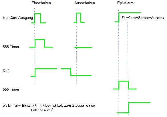 Bei Ein- und Ausschalten des Epi-Care-Geraets wird jeweils ein kurzes Alarmsignal ausgegeben, so dass das Walkie-Talkie das Buzzer-Geraeusch uebertraegt. Die ueberwachende Person weiss aber, dass dies nur Ein- und Ausschalten bedeutet (z.B. auch bei Fehlalarm) und keinen Anfall meldet, denn bei Anfall hoert das Buzzer-Geraeusch nicht auf.